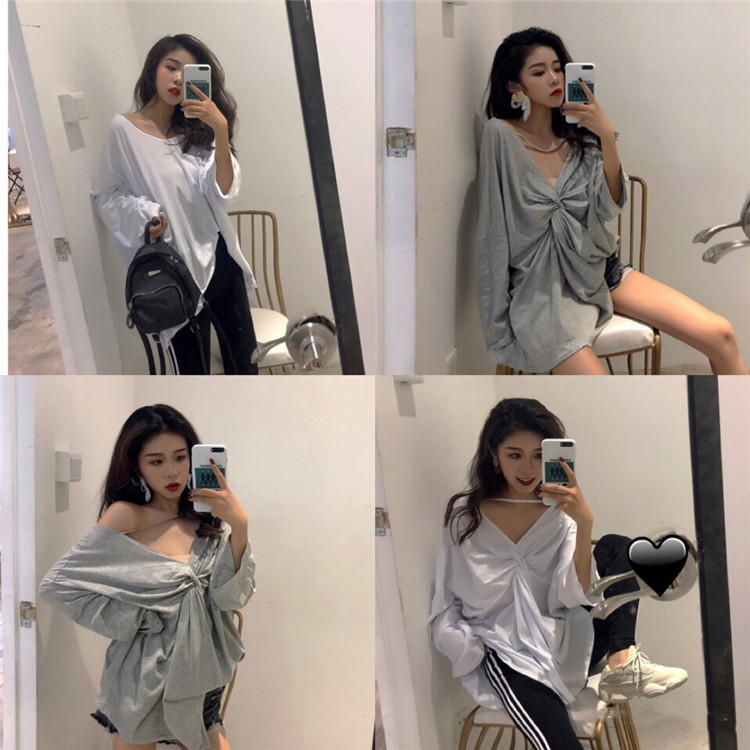 / 早秋下半身失蹤長袖兩穿V領新款設計感時尚百搭褶皺露背中長款T恤