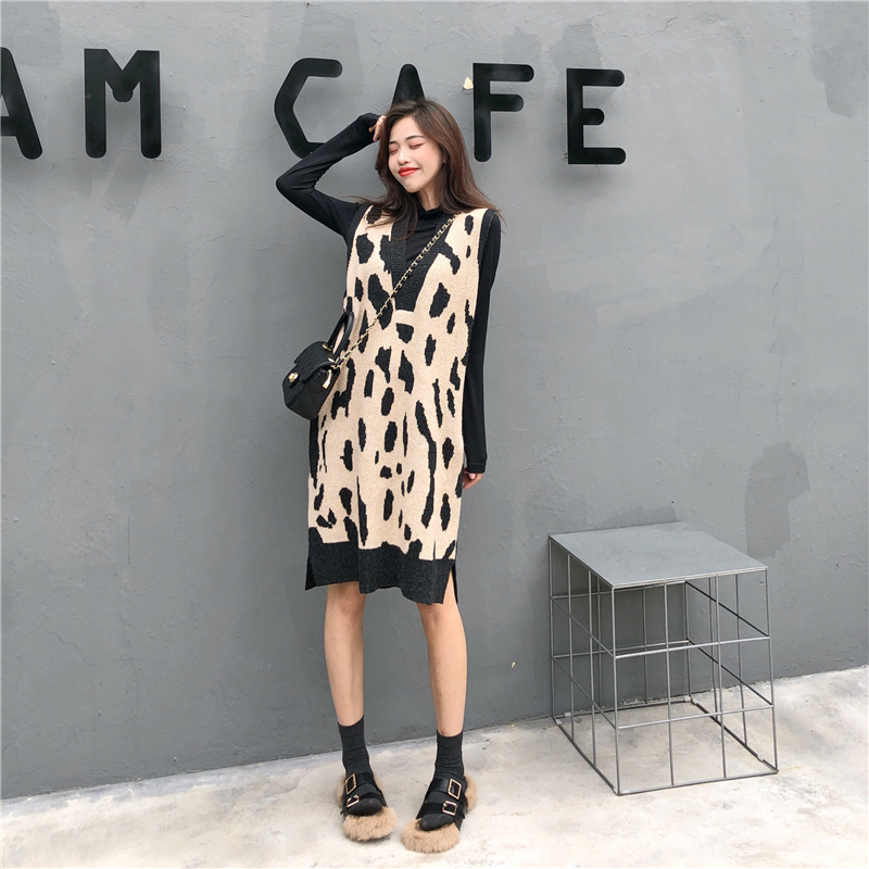 秋冬時尚女裝新款韓版chic慵懶風寬松百搭豹紋V領中長款針織馬甲