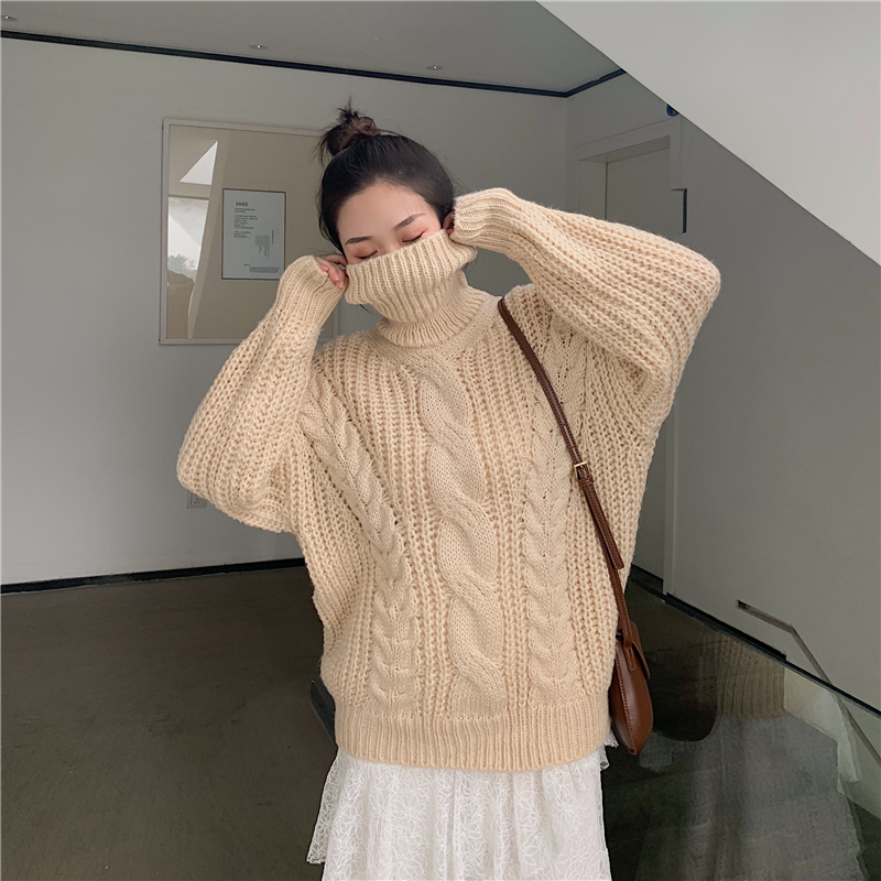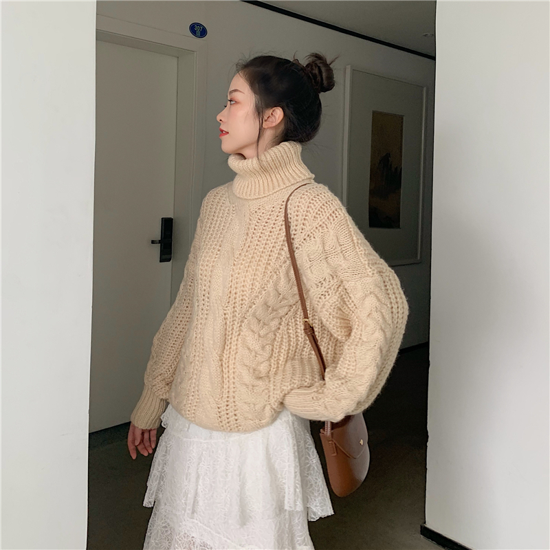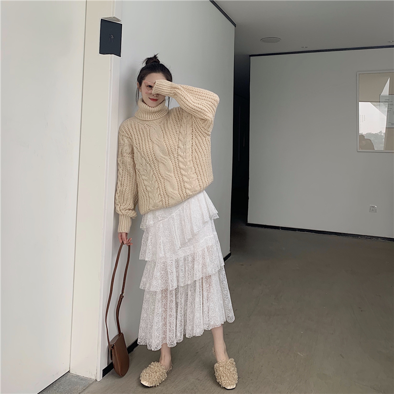 / 韓版新款chic女寬松高領麻花加厚針織毛衣甜美蕾絲蛋糕裙時尚套裝