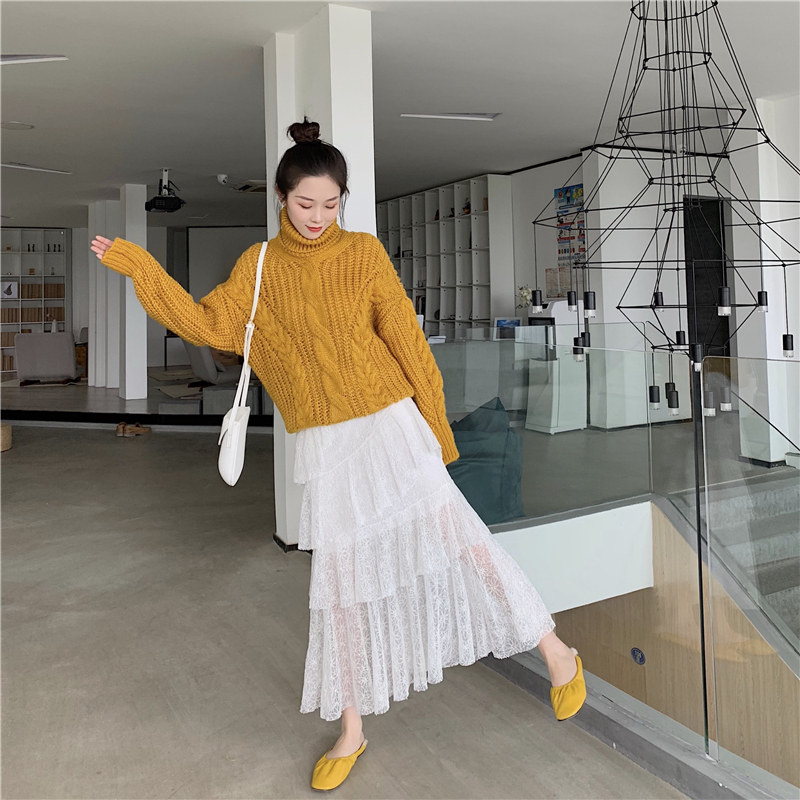 韓版新款chic女寬松高領麻花加厚針織毛衣甜美蕾絲蛋糕裙時尚套裝
