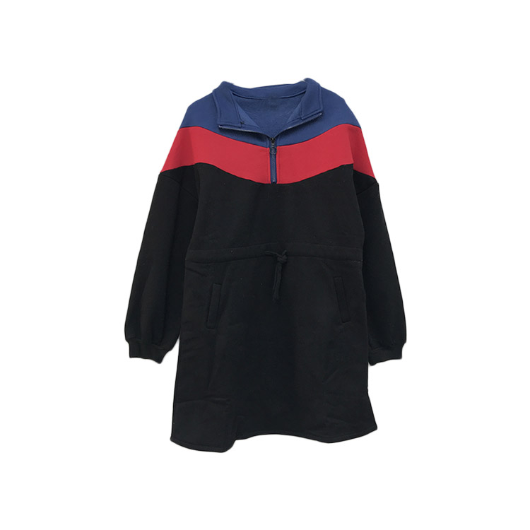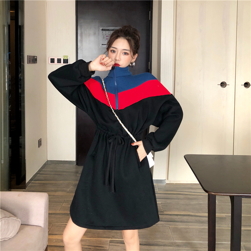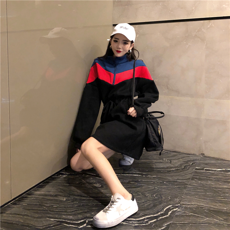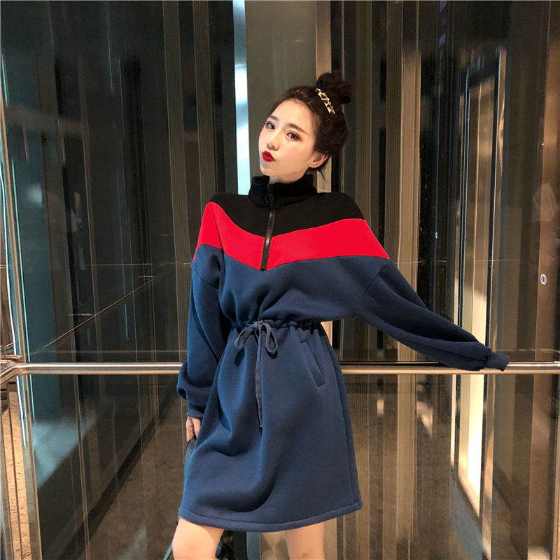 復古韓國chic風寬松撞色拉鏈拼色收腰顯瘦百搭長袖立領衛衣連衣裙