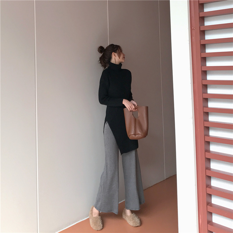 慵懶高領針織開叉毛衣女秋冬2018新款+ 純色休閑褲闊腿褲長褲套裝