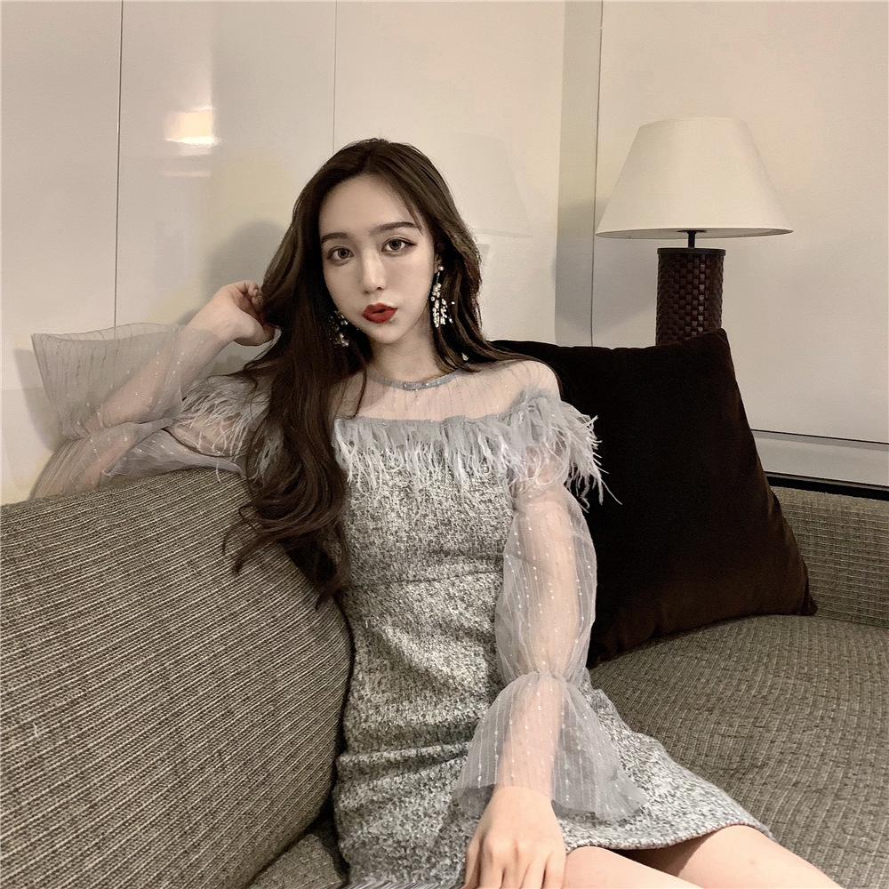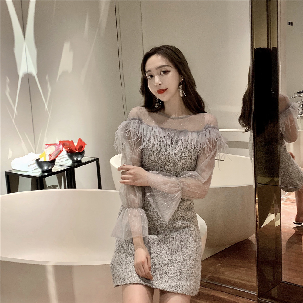 / 名媛氣質秋冬新款女裝高腰羽毛流蘇高貴網紗拼接A字連衣裙半身裙