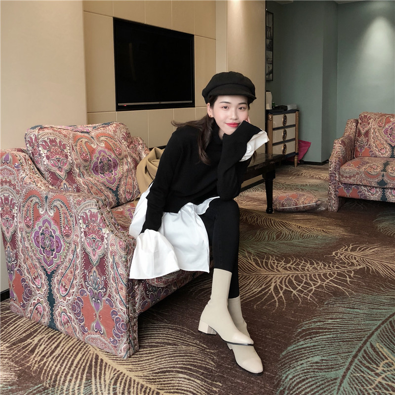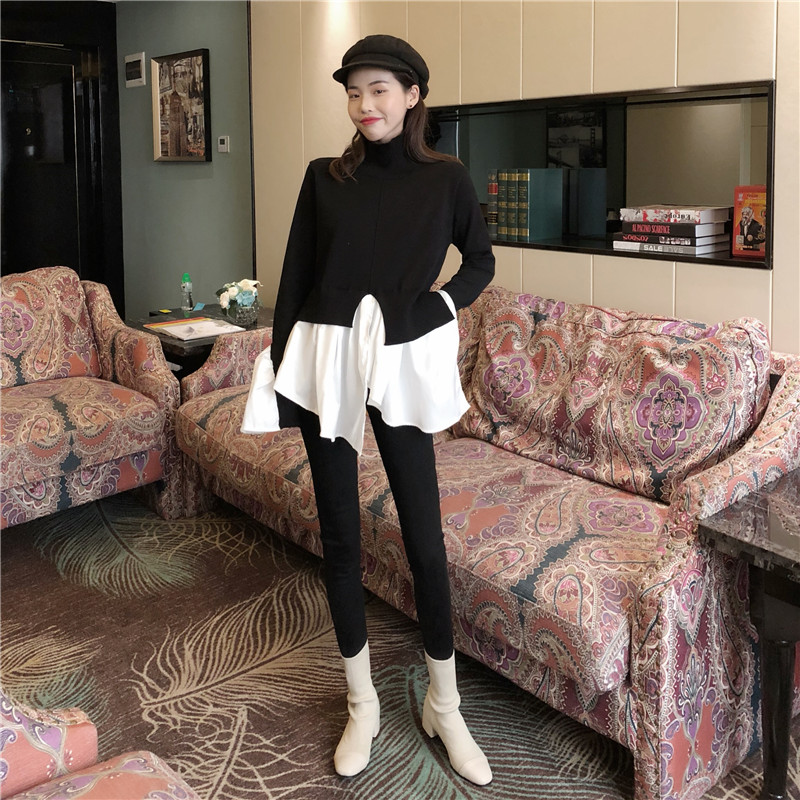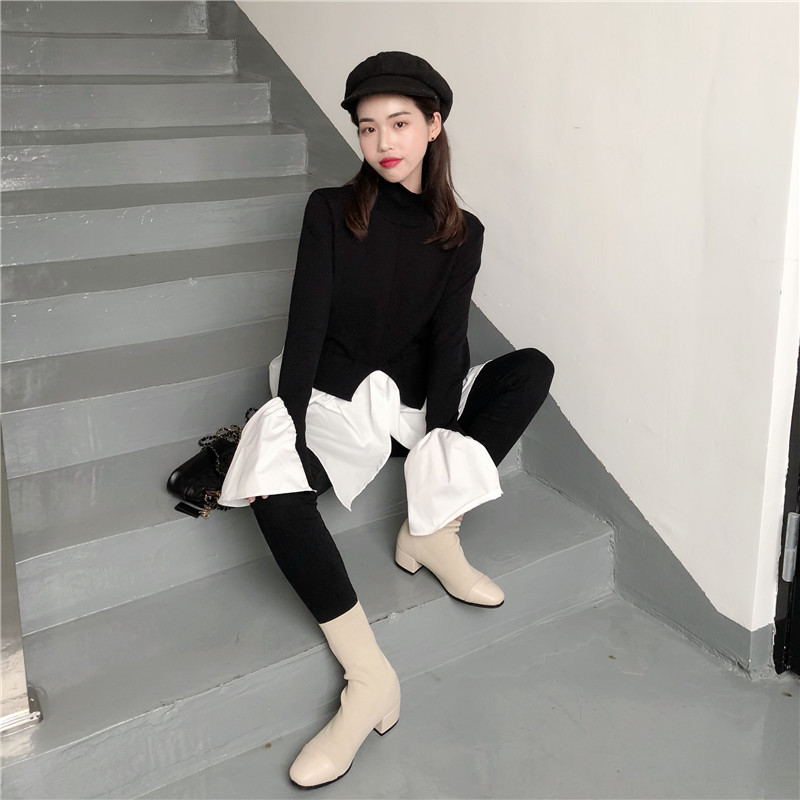 / 秋季新款韓版設計感假兩件拼色半高領不規則喇叭袖襯衫針織衫上衣