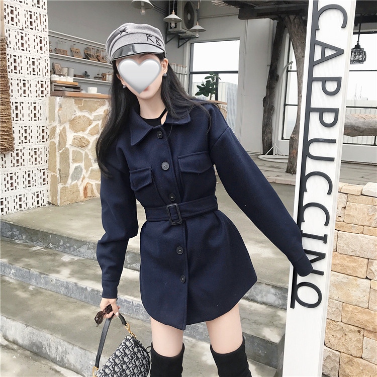 外套女春秋2018新款時尚chic簡約寬松顯瘦中長款呢子外套女配腰帶