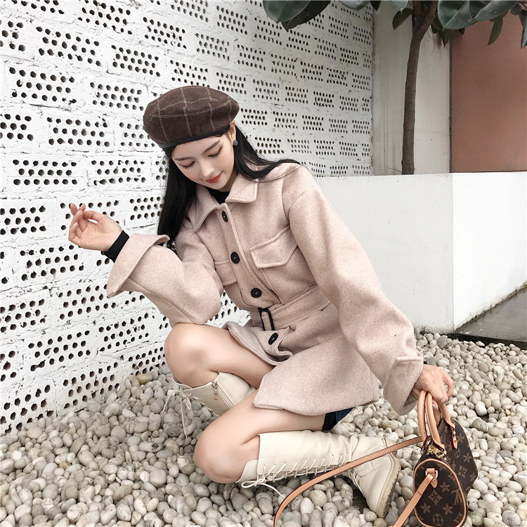 / 復古翻領單排扣綁帶收腰中長款毛呢外套女秋冬2018新款韓版大衣女
