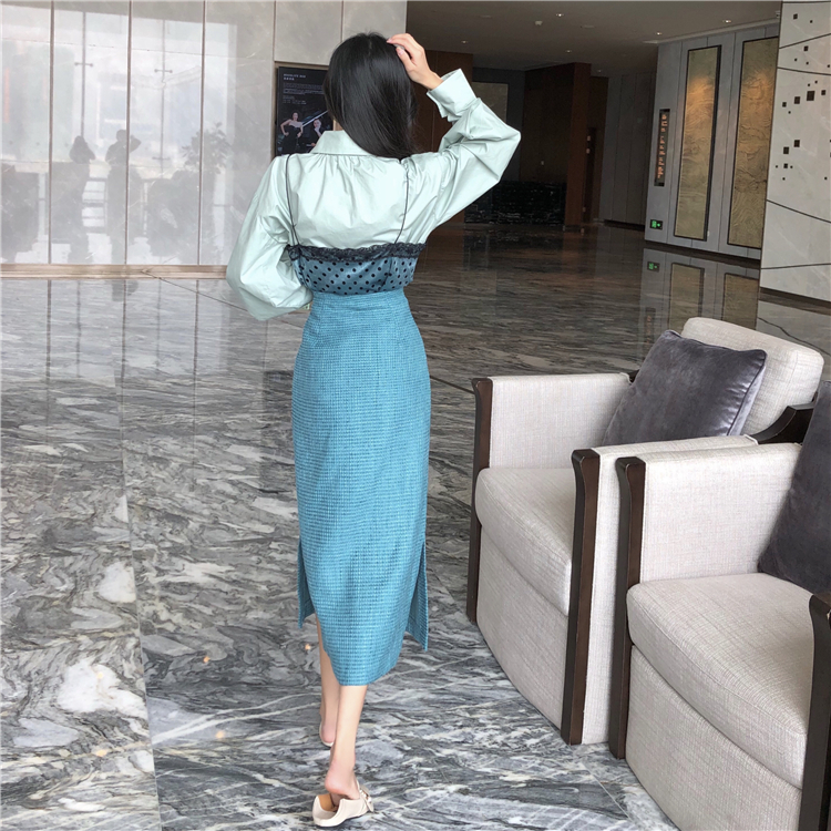 / 新品港味復古寬松波點吊帶襯衣時尚套裝中長款氣質包臀裙三件套女