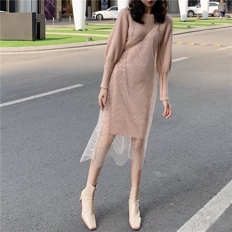 韓版秋裝女2018新款套裝溫柔風珠片繡鉆吊帶+針織連衣裙女兩件套