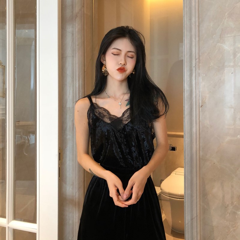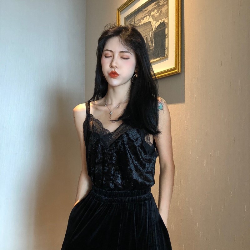 / 秋季韓版時尚百搭V領蕾絲花邊拼接遮肚子吊帶背心女性感打底內搭