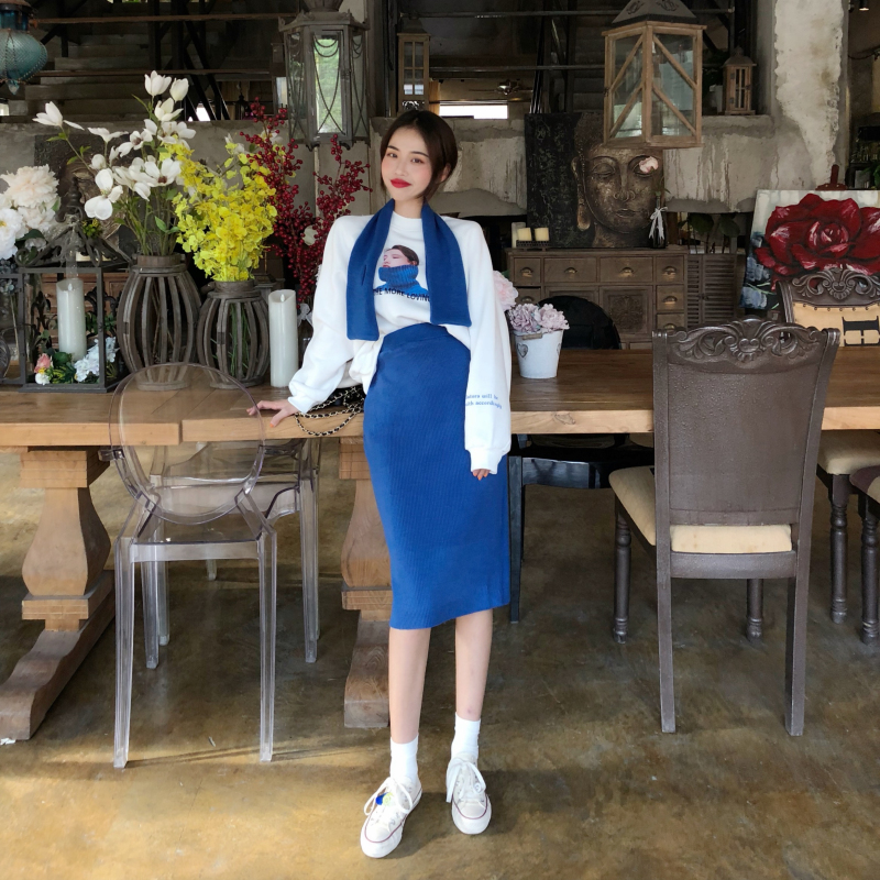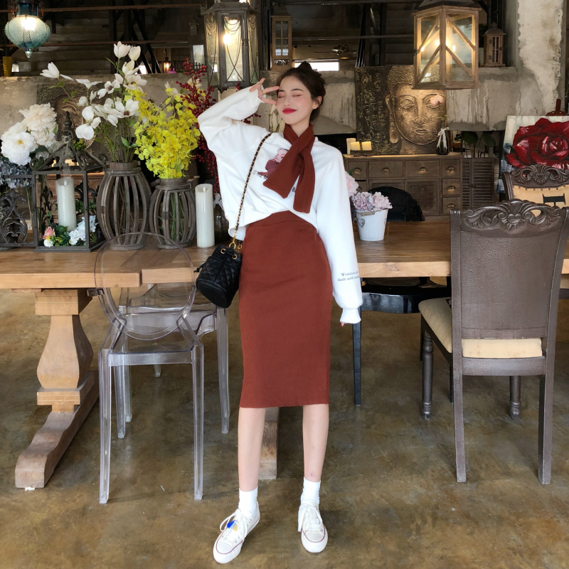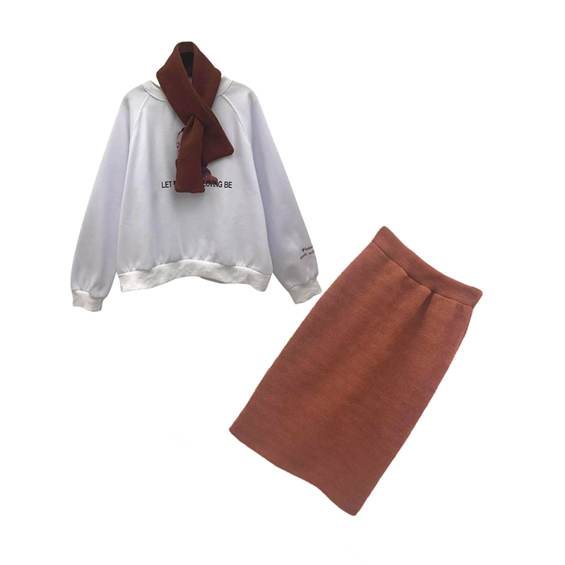 / 韓版加絨寬松人像圖案圍脖衛衣高腰純色包臀裙時尚套裝chic兩件套