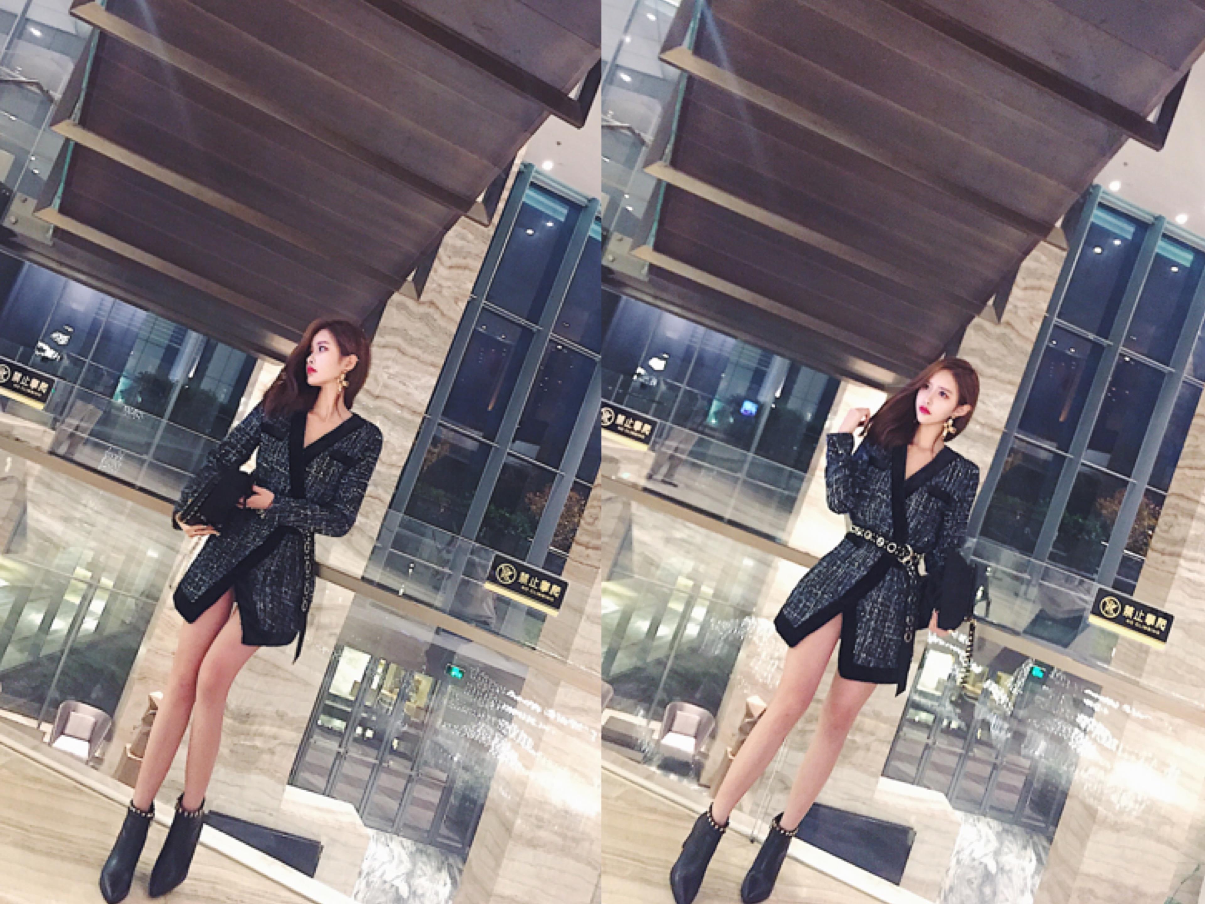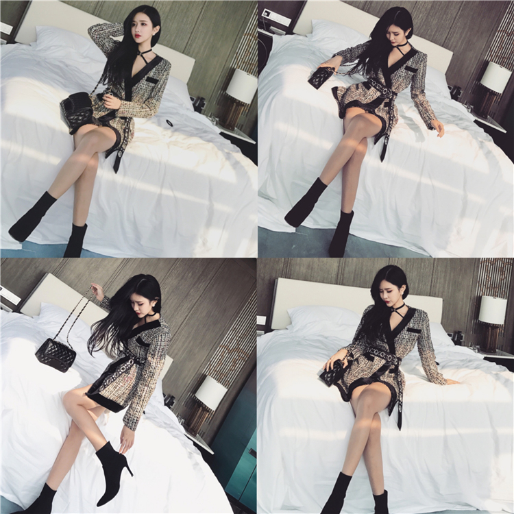 / 2018秋裝新款韓版名媛小香風粗毛呢長袖V領連衣裙外套金屬圈腰帶