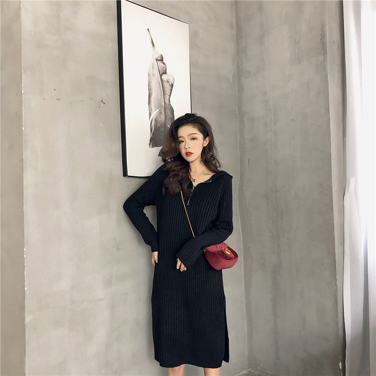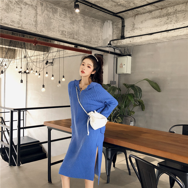 / 韓國chic風連帽針織衫坑條拉鏈長款網紅套頭毛衣連衣裙女2018新款
