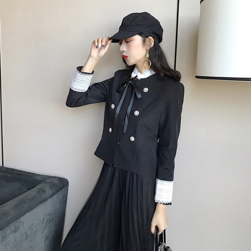 / 秋裝女2018新款蝴蝶結修身短款花邊小西服外套+中長網紗半身裙女