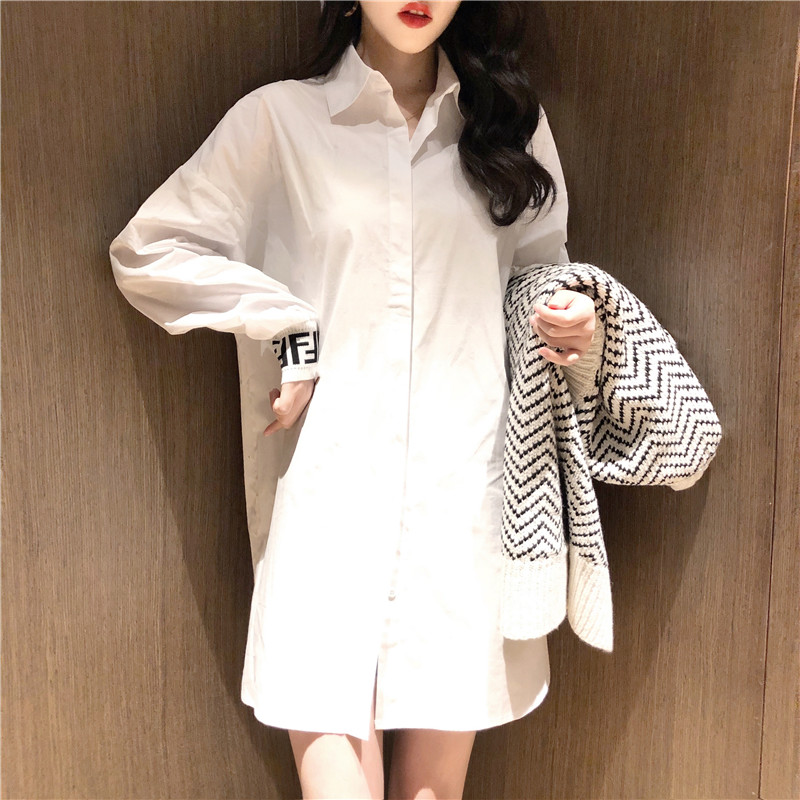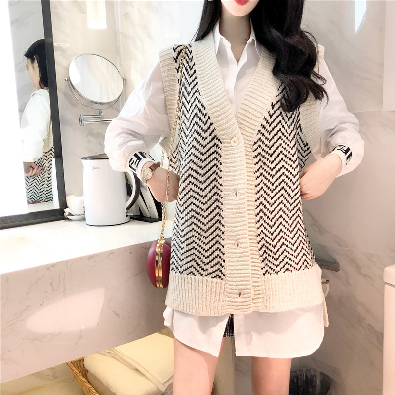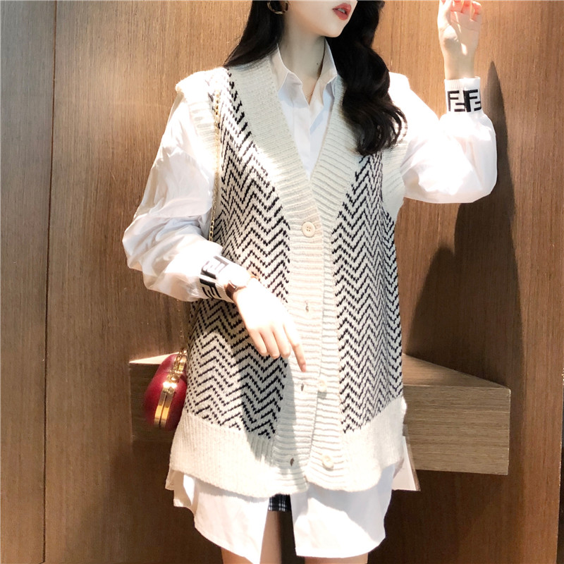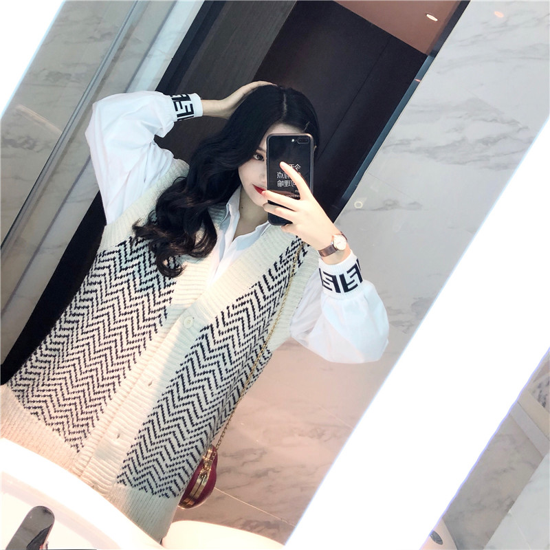 復古韓國chic風寬松顯瘦白襯衣+條紋毛衣女2018新款無袖開衫馬甲