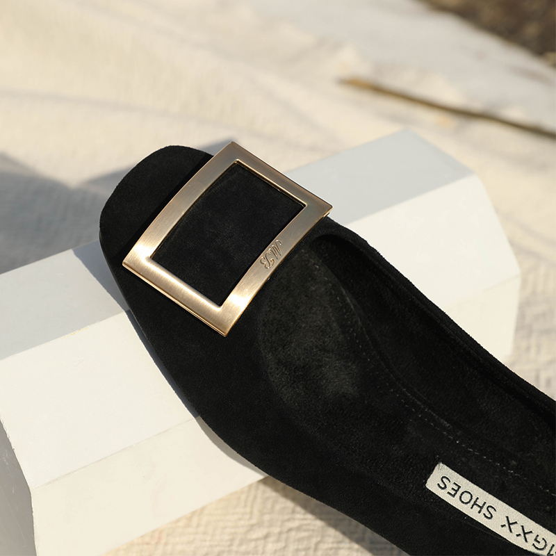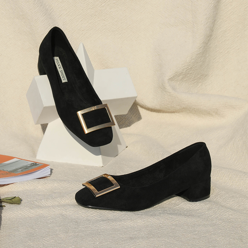 / MG小象中跟淺口女鞋冬季時尚單鞋2018新款金屬方扣黑色粗跟高跟鞋