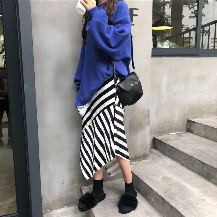 / 女神套裝秋冬新款撞色拼接坑條假兩件中長款衛衣+百搭條紋半身裙