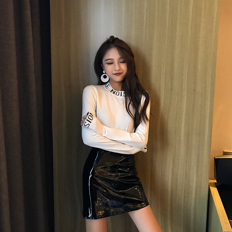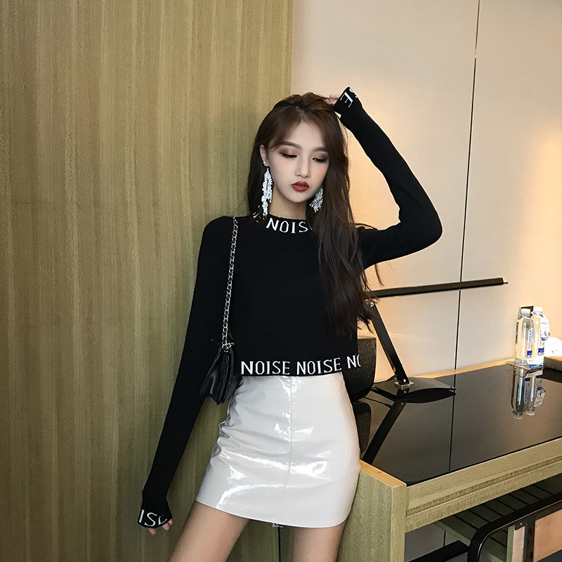/ 原宿風長袖女t恤秋chic字母半高領高腰短款長袖圓領套頭打底上衣