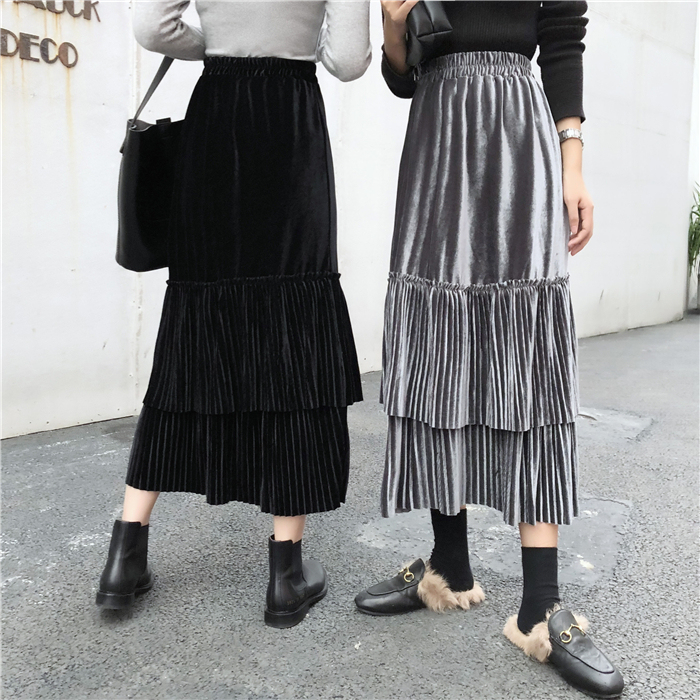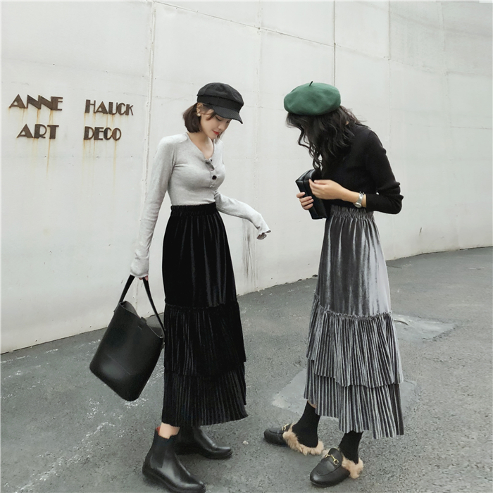 / 裙子女秋冬新款韓版寬松百搭絲絨百褶裙半身裙高腰A字裙學生長裙