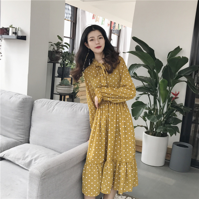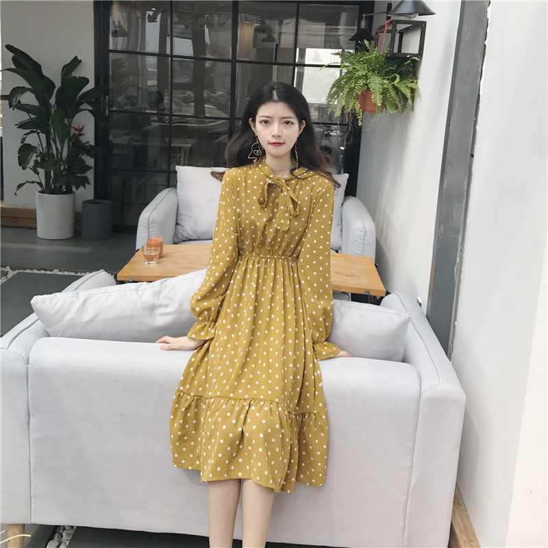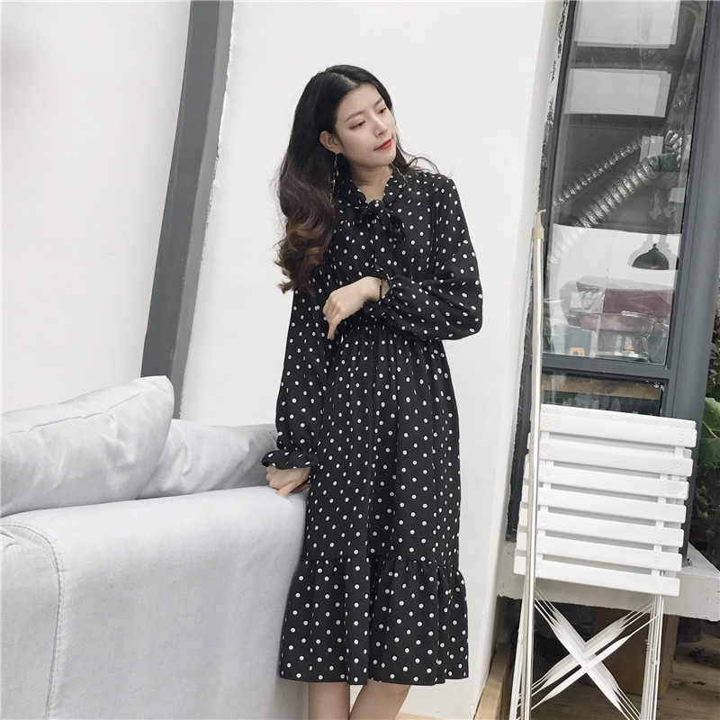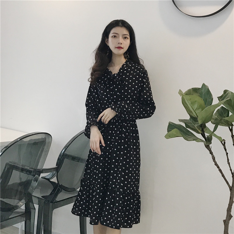 / .晚晚風2018秋裝新款早秋領口綁帶V領顯瘦雪紡中長款波點連衣裙女