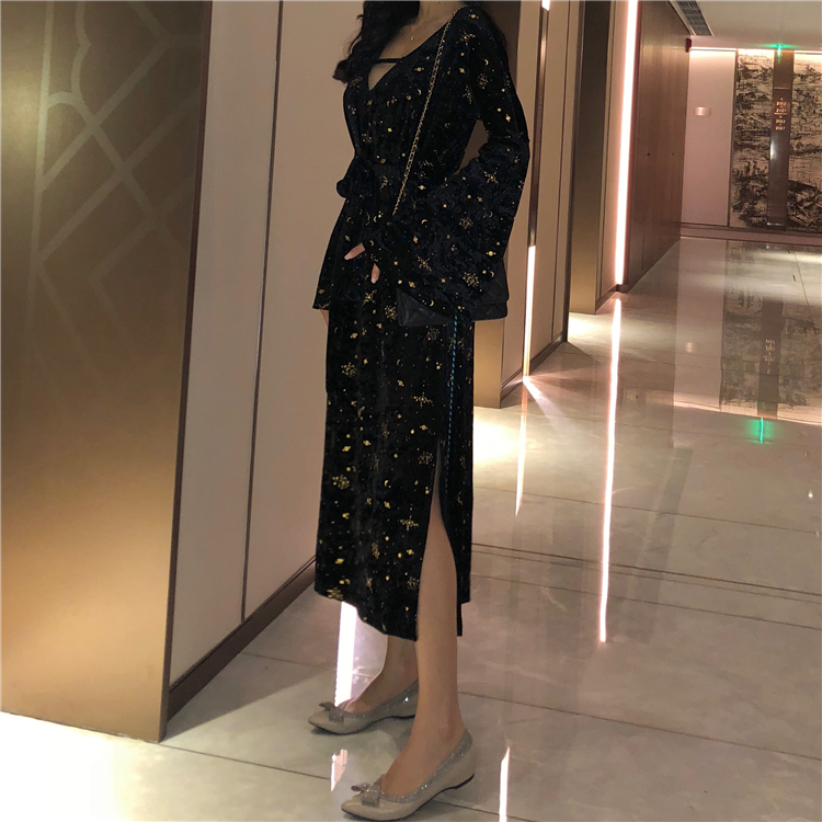 秋冬2018新款復古長袖V領中長款連衣裙小心機時尚顯瘦晚晚風裙子