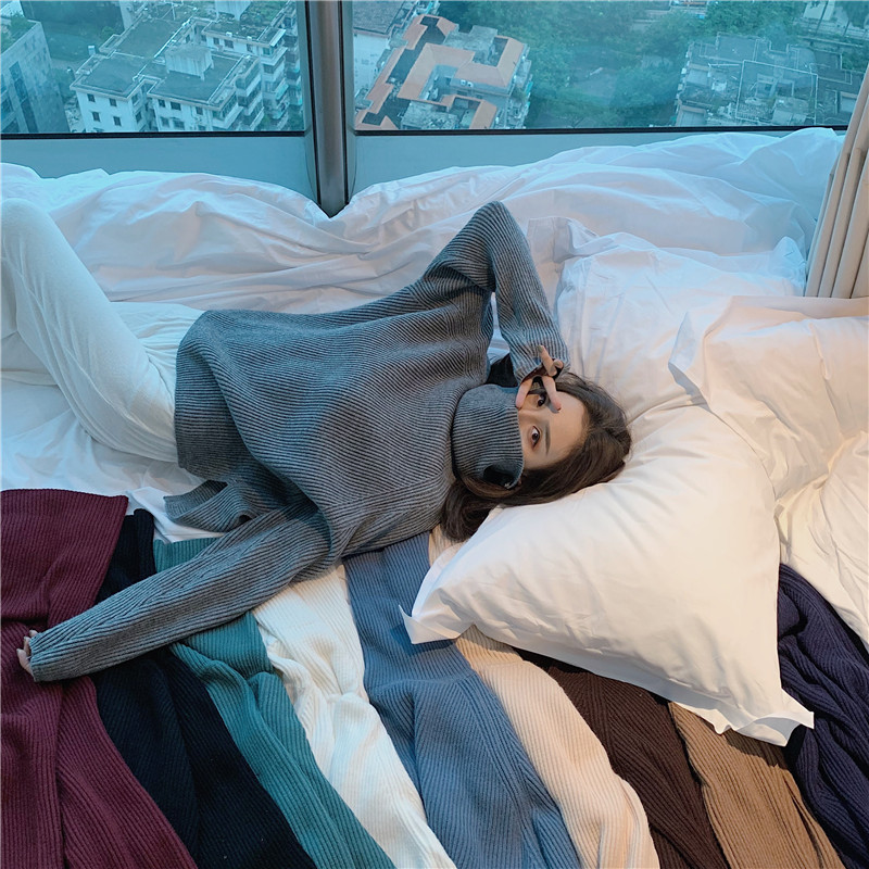 復古慵懶風套頭毛衣女2018新款冬百搭糖果色包心兔毛堆堆領~10色