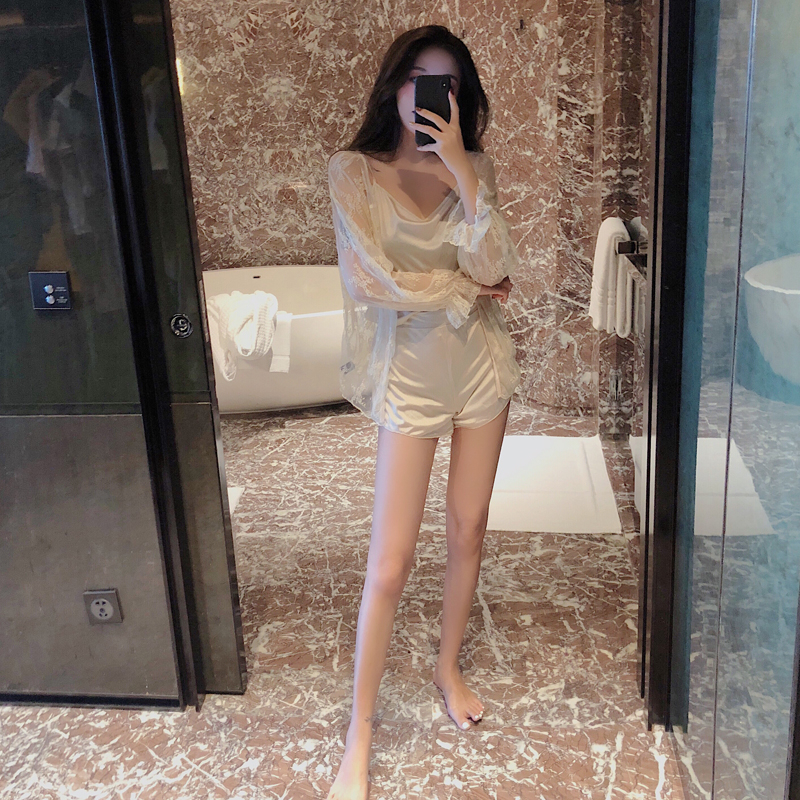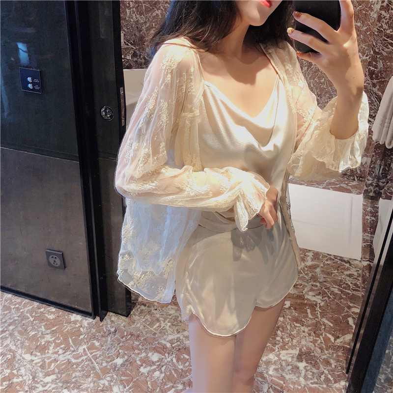 / 夏季舒適韓版溫柔蕾絲開衫吊帶背心短褲睡衣三件套復古家居服套裝