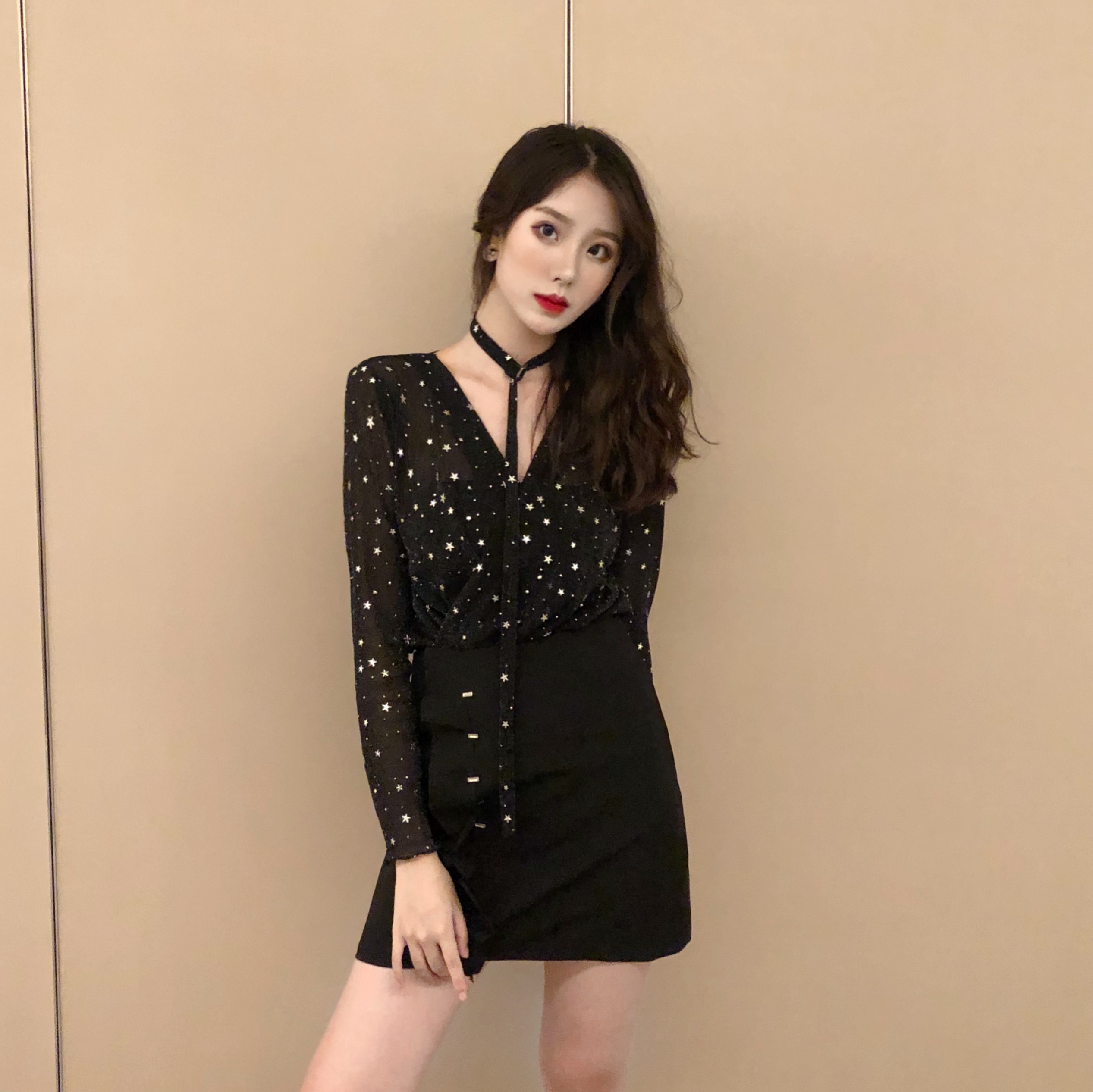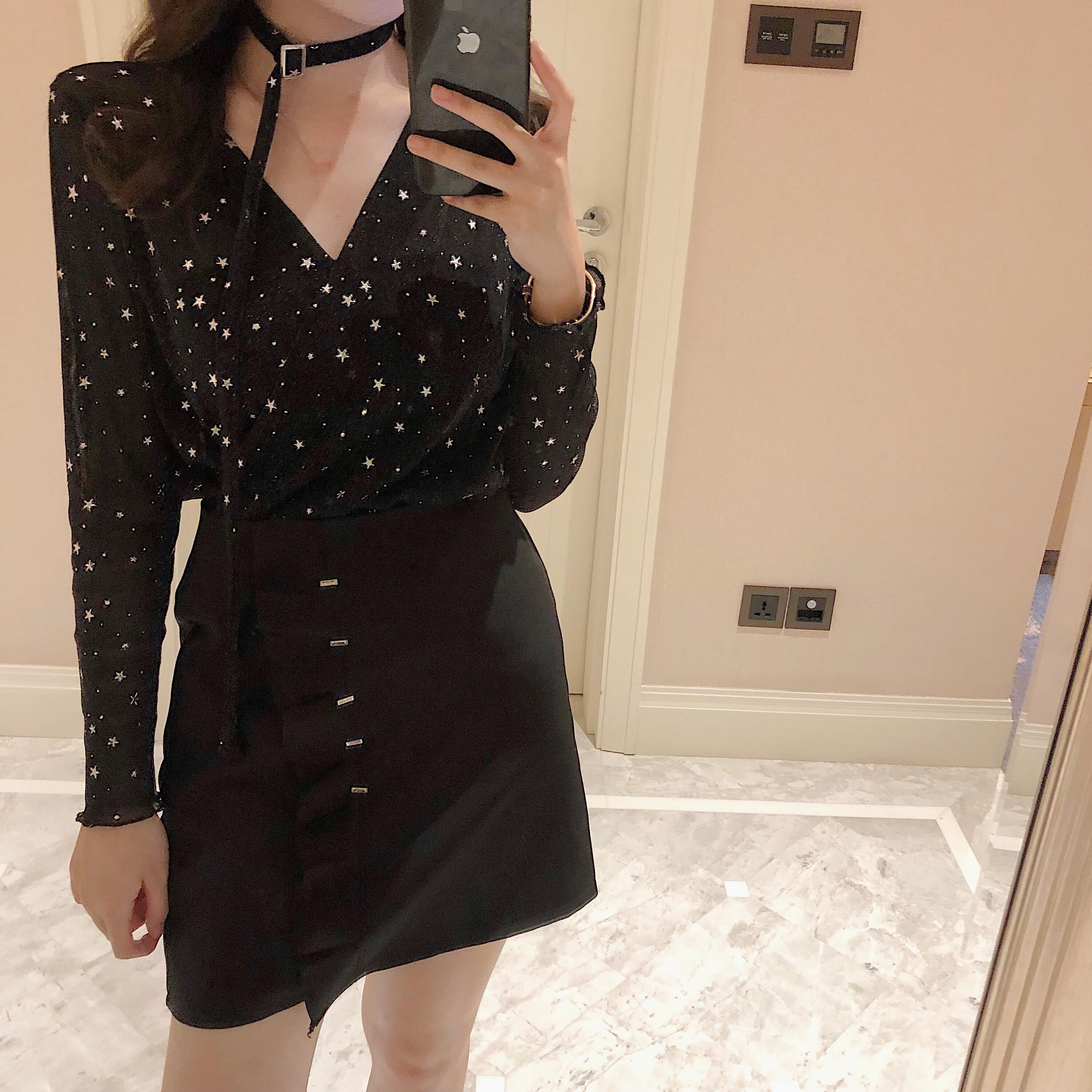 / 網紅韓版秋季時尚小香風V領長袖打底衫女神荷葉邊半身裙兩件套裝