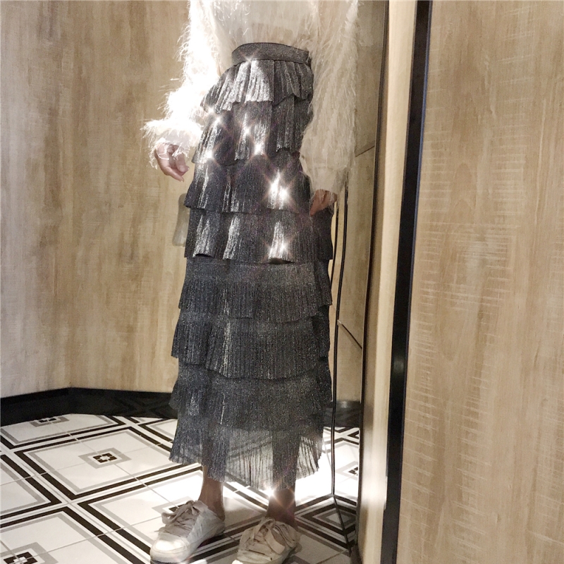 2018秋裝港味亮絲V領襯衫上衣女+高腰時尚氣質閃閃亮絲蛋糕半身裙
