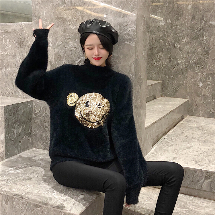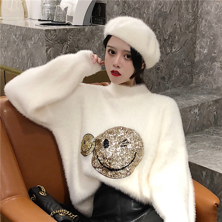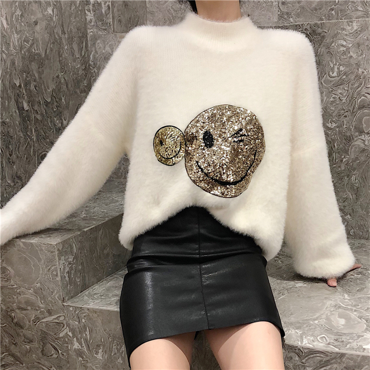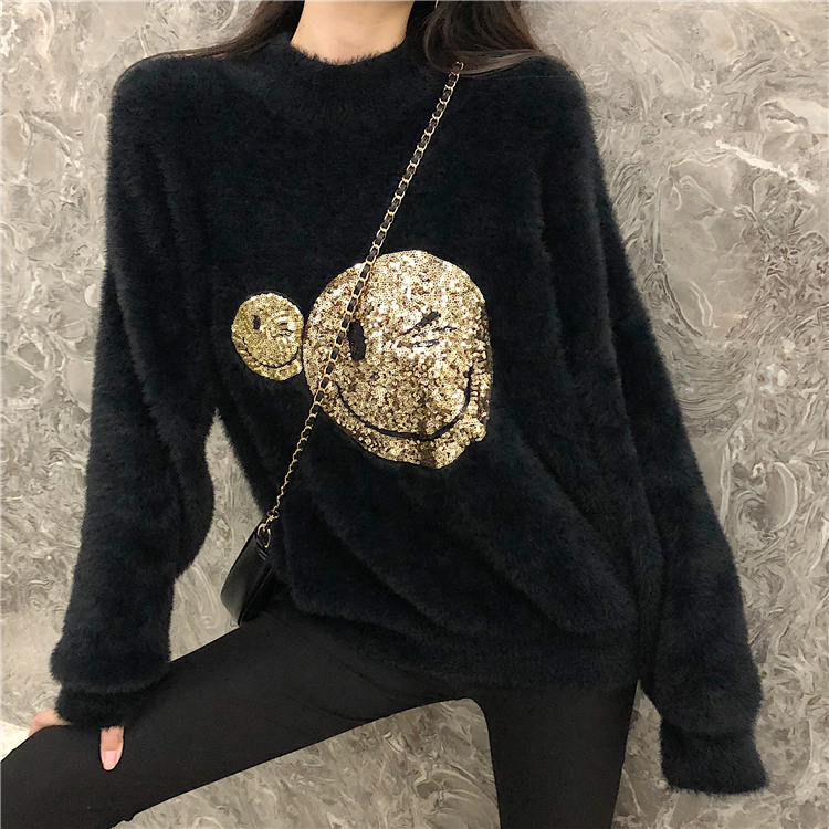 2018秋冬季新款韓版時尚寬松慵懶毛衣女毛絨絨圓領套頭笑臉上衣潮