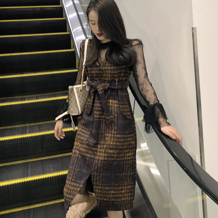 氣質復古韓版格子毛呢長款連衣裙+時尚喇叭袖網紗打底衫上衣女