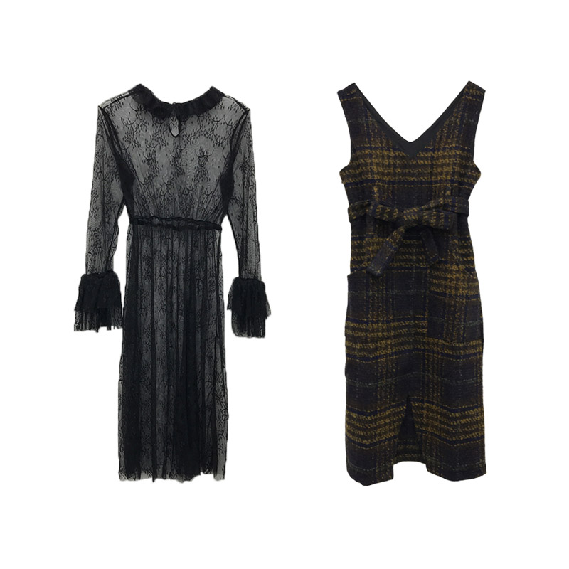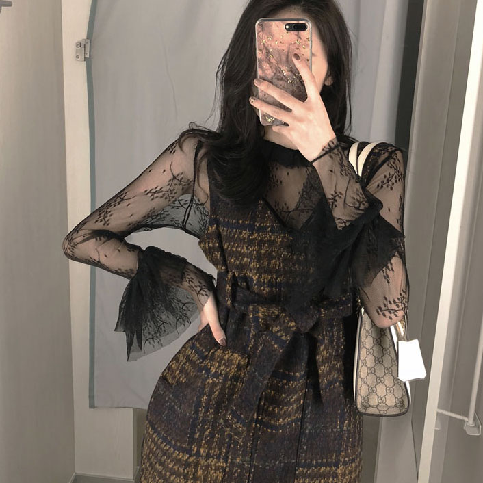 / 氣質復古韓版格子毛呢長款連衣裙+時尚喇叭袖網紗打底衫上衣女