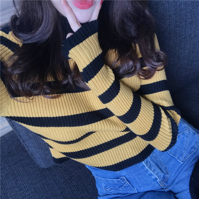 chic風早秋上衣女2018新款韓版時尚顯瘦百搭條紋套手指針織衫毛衣
