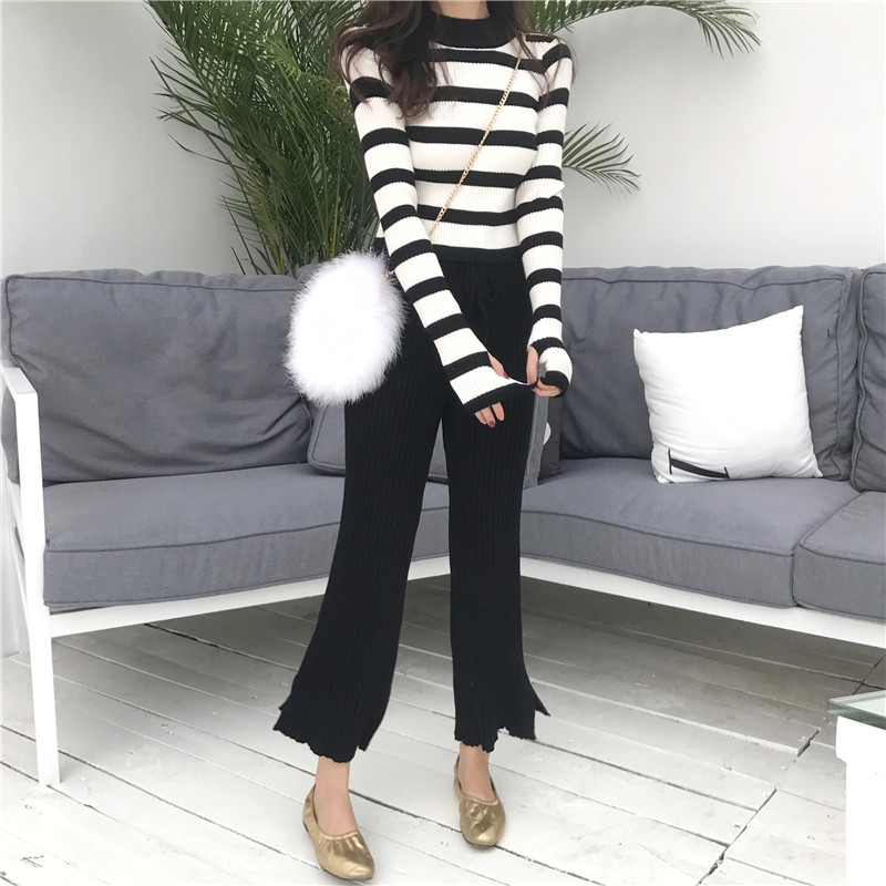 / chic風早秋上衣女2018新款韓版時尚顯瘦百搭條紋套手指針織衫毛衣