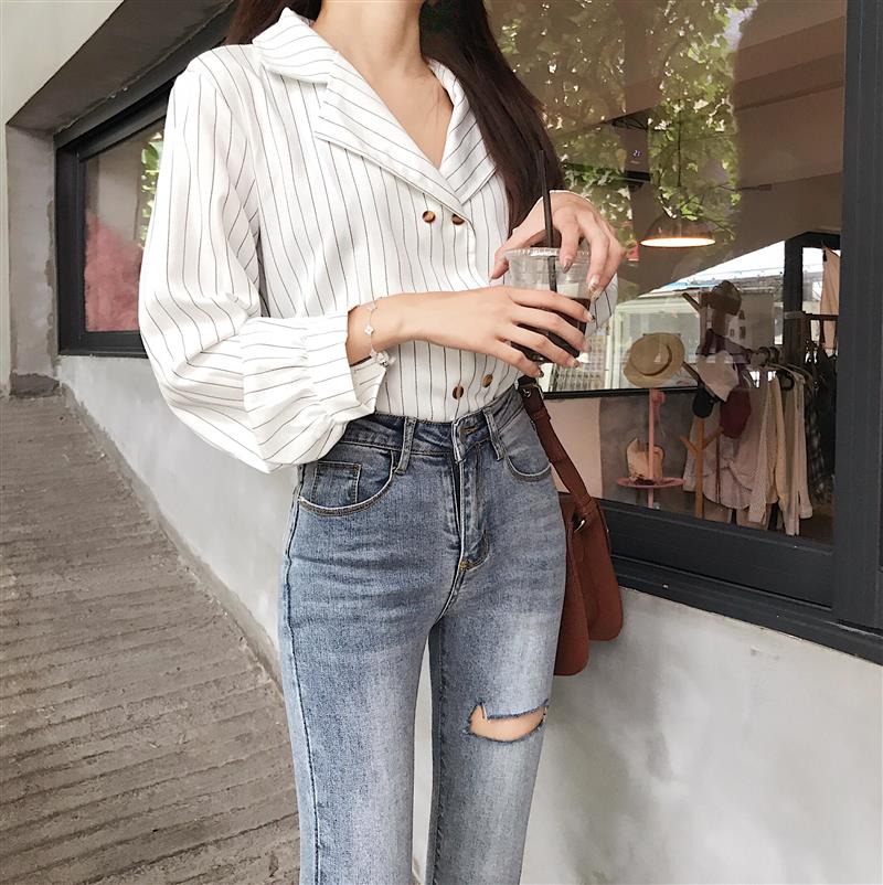/ 新款chic秋季破洞剪邊九分牛仔褲女韓版修身顯瘦高腰小腳鉛筆褲潮