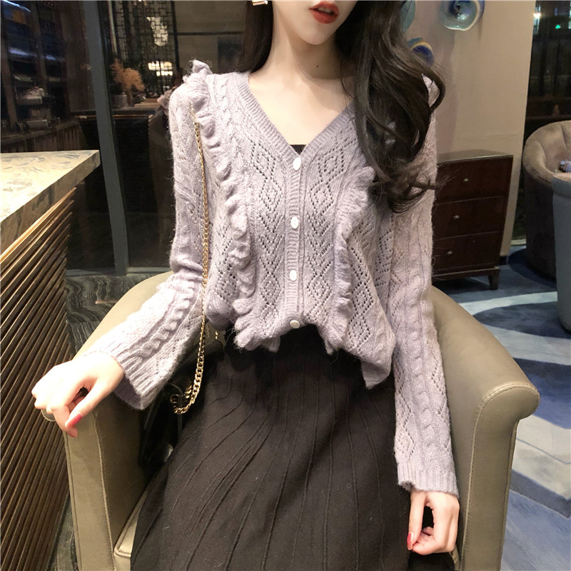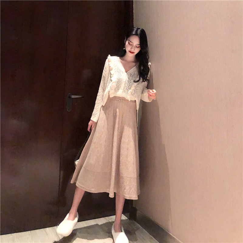 韓國復古風木耳邊毛衣女秋冬2018新款開衫外套+高腰針織半身裙女