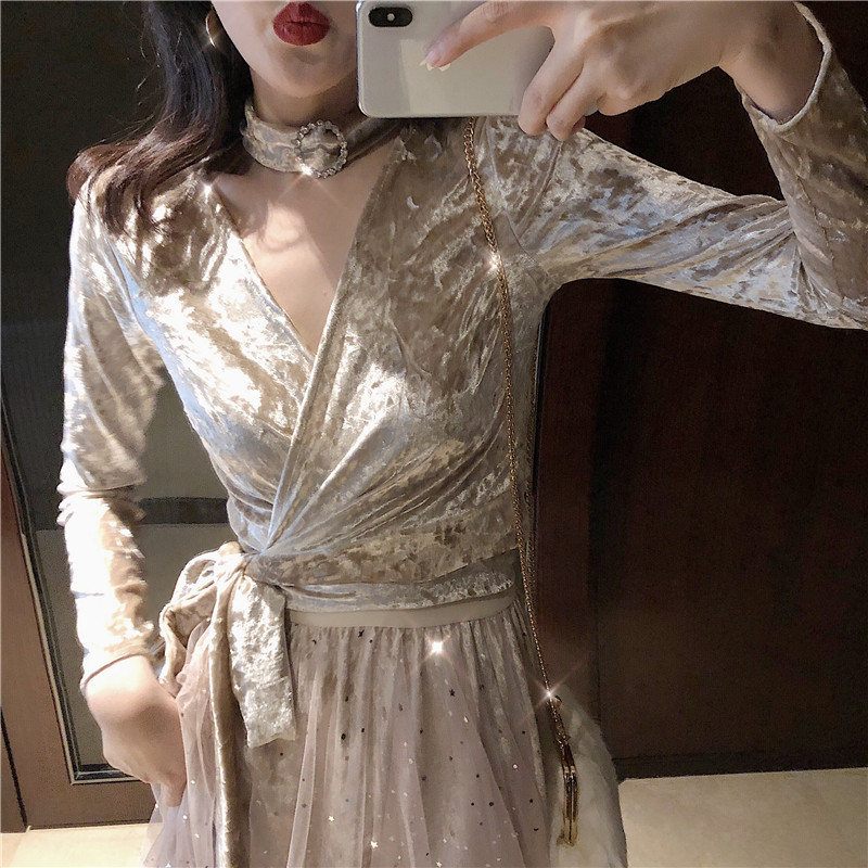 港味秋冬2018新款溫柔風套裝時尚氣質絲絨上衣+網紗半身裙兩件套