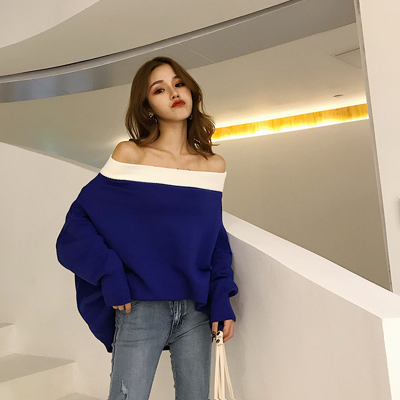/ 中長款一字領長袖寬松毛衣百搭慵懶新款秋季韓版chic小心機上衣女