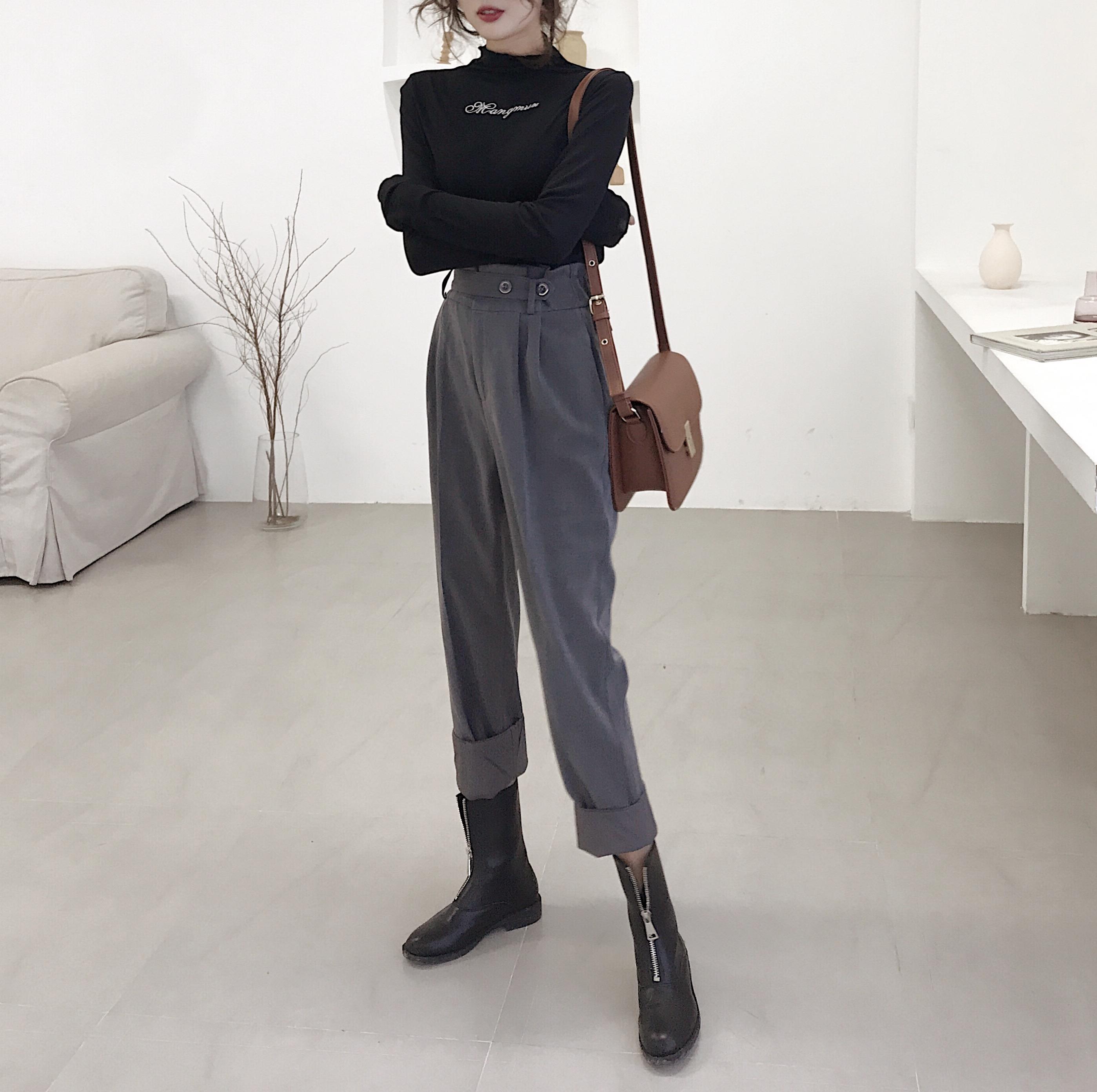 / 秋冬新款時尚套裝韓版半高領刺繡長袖打底衫高腰闊腿哈倫褲兩件套