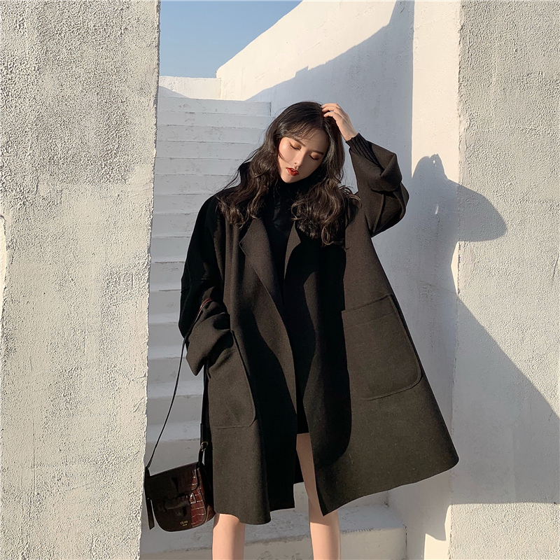 復古溫柔慵懶風隨意暖色系百搭寬松中長款毛呢外套女韓版呢子大衣