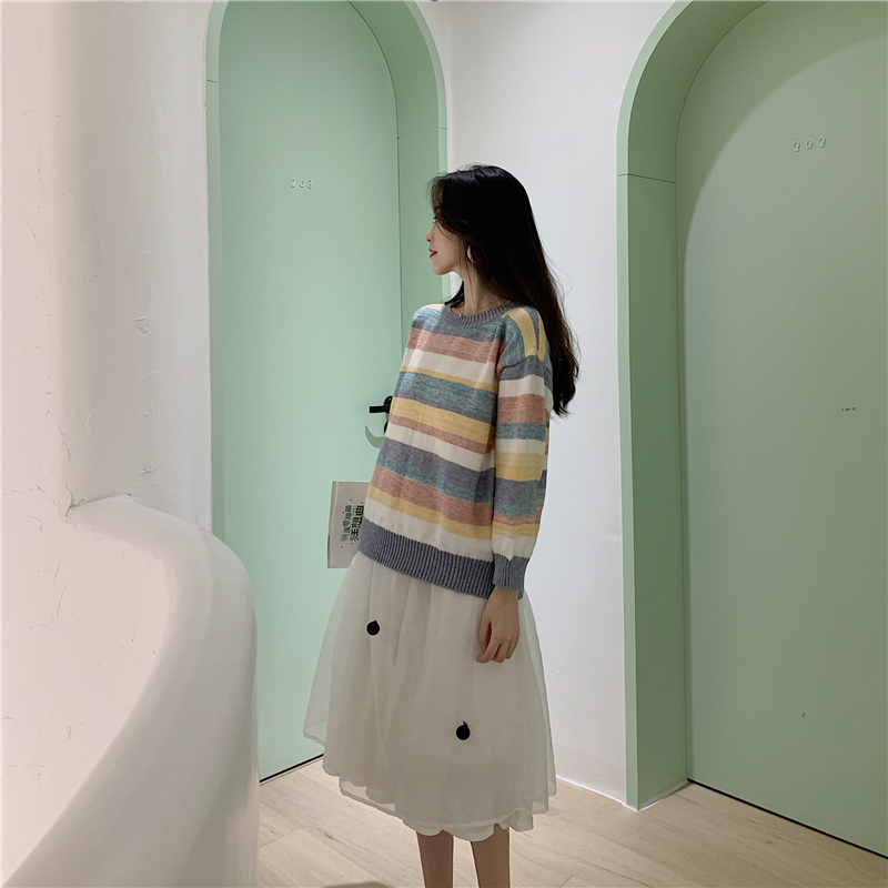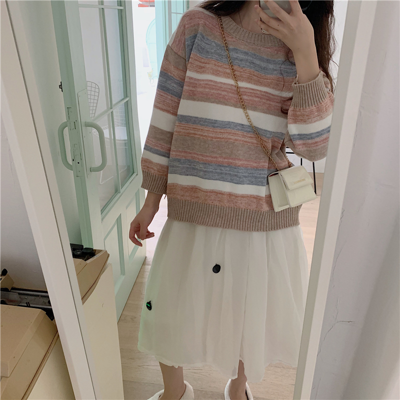 / 2018冬季新款休閑拼色毛衣修身九分袖上衣+高腰網紗半身裙女套裝