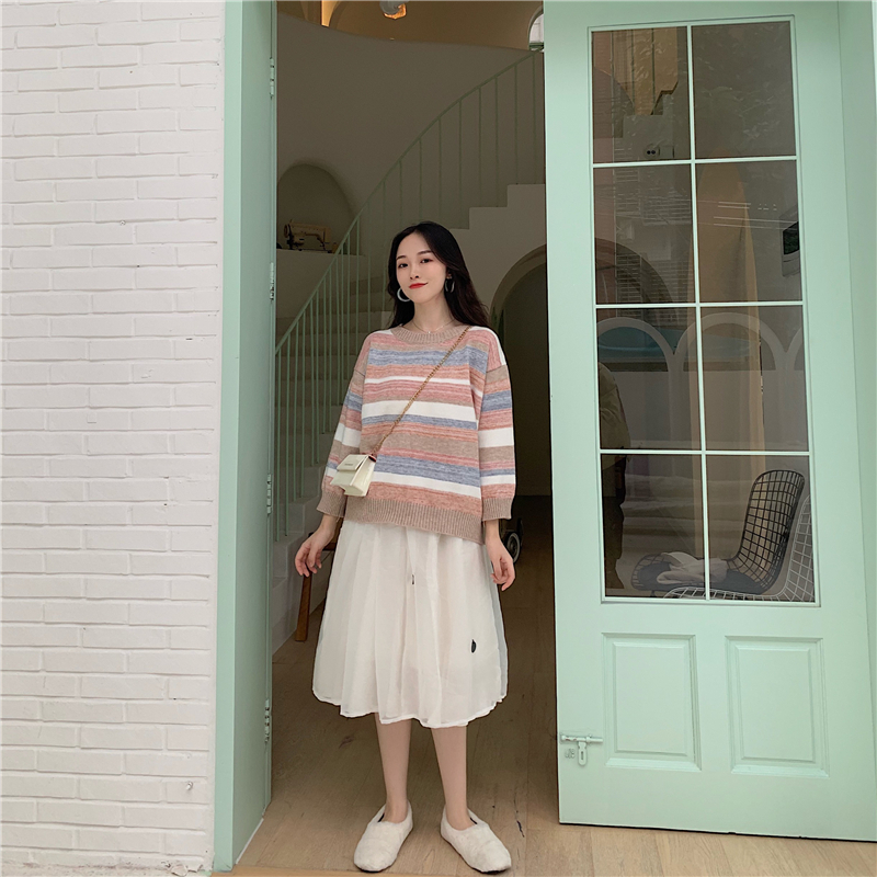 2018冬季新款休閑拼色毛衣修身九分袖上衣+高腰網紗半身裙女套裝