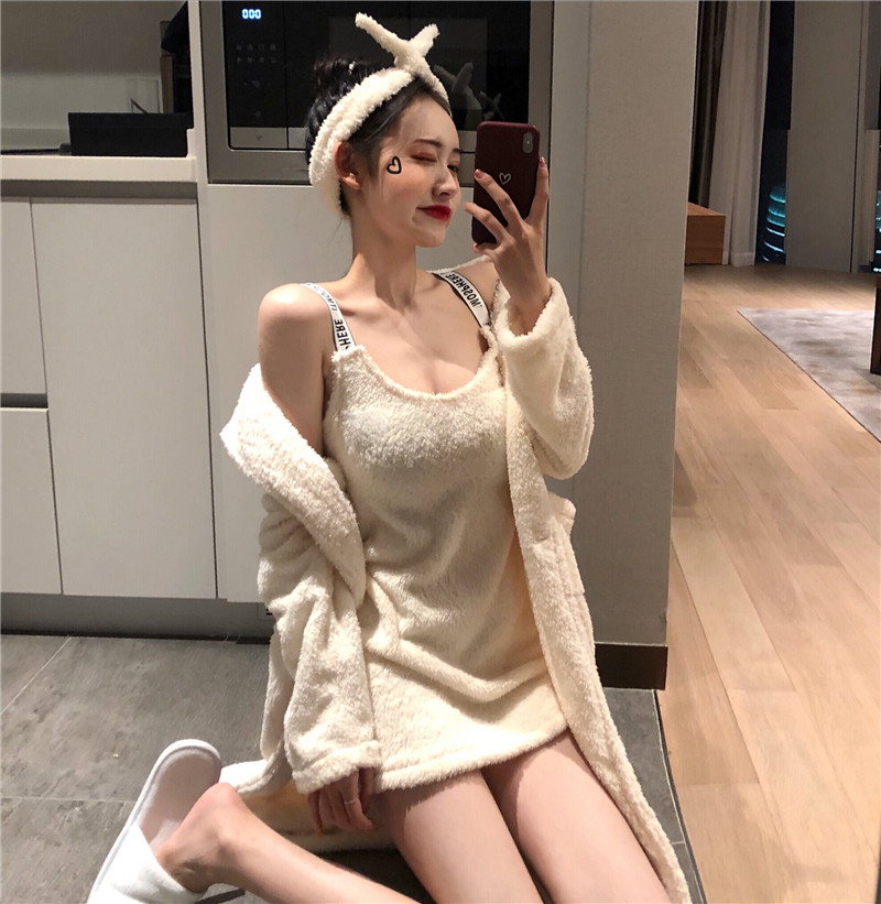 2018新款復古性感睡衣女秋冬外套加吊帶發帶保暖純色家居服套裝潮