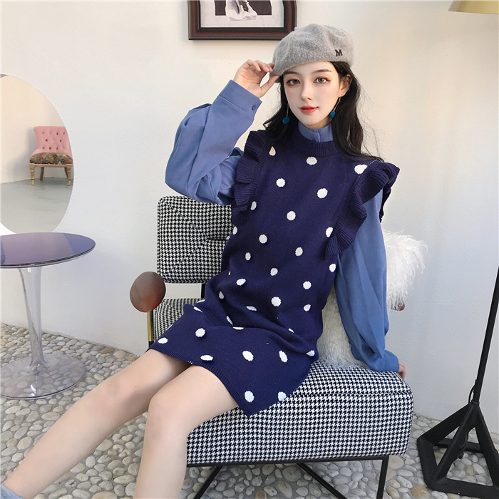/ 女神套裝秋冬新款長袖修身襯衫+木耳邊波點加厚針織背心裙兩件套
