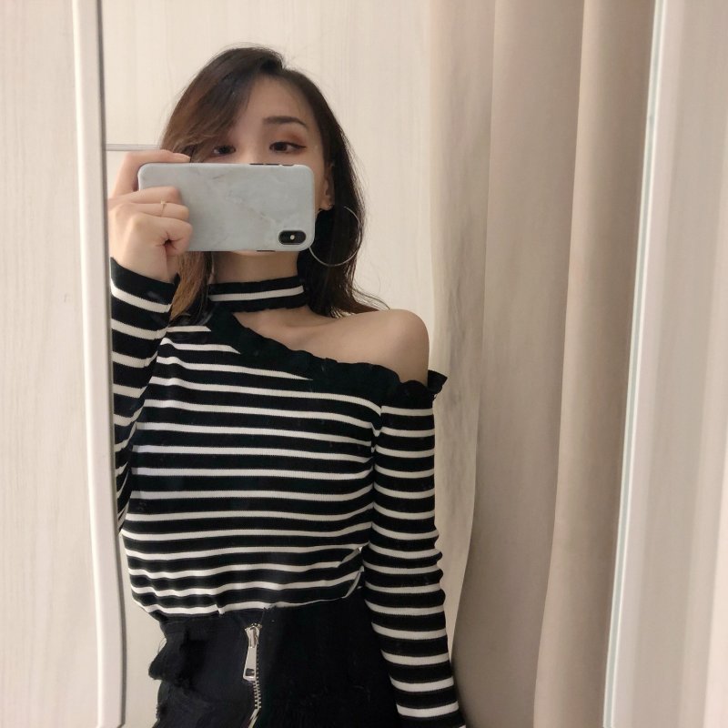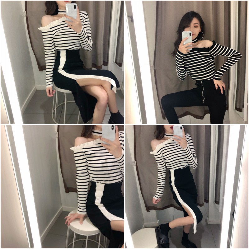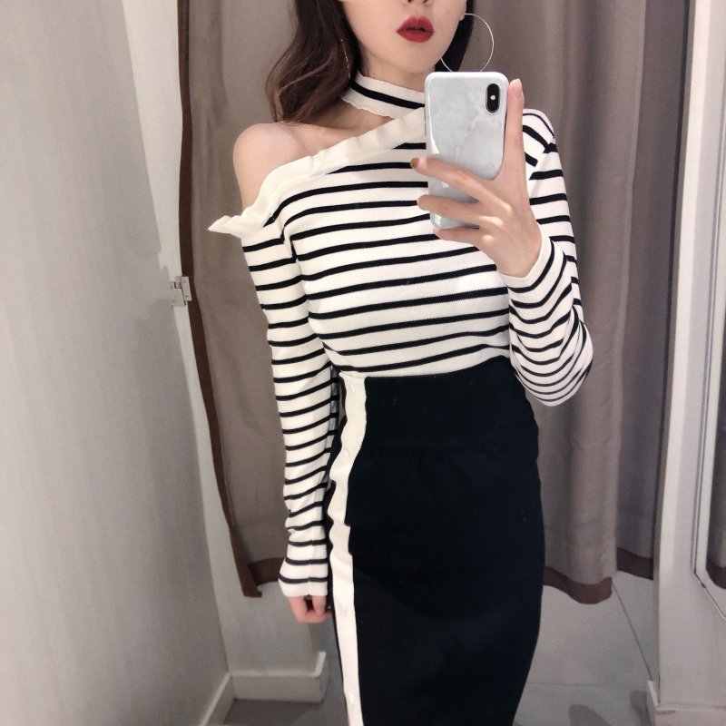 / 新款露肩掛脖條紋長袖針織衫開叉毛線半身裙港風時尚套裝兩件套女