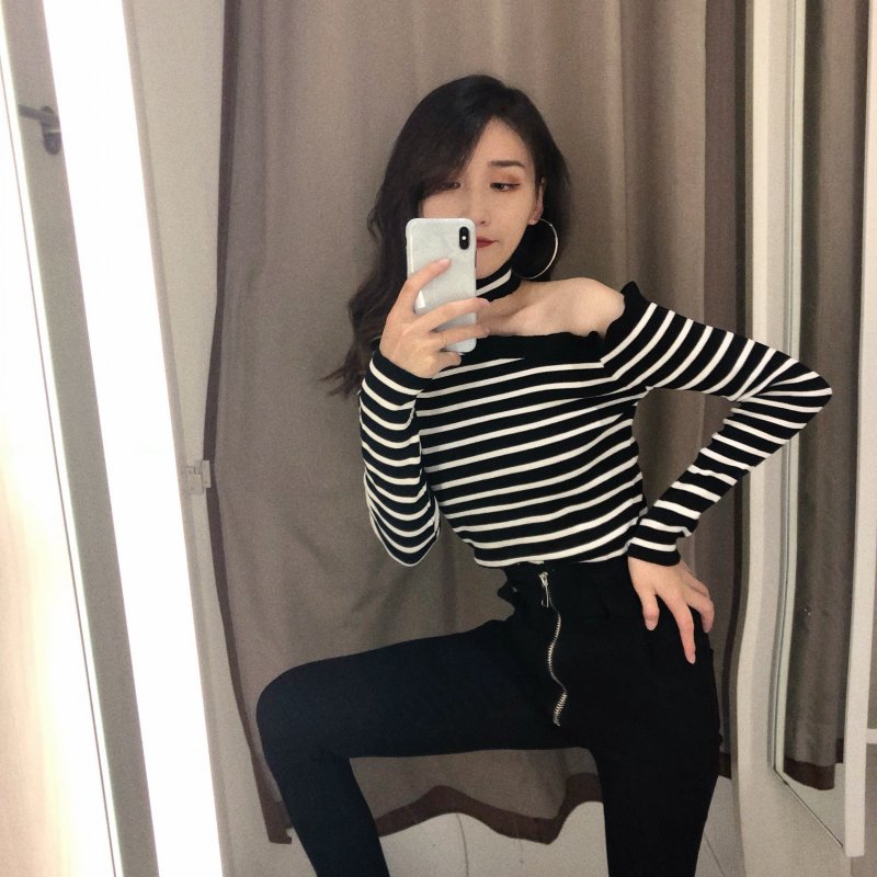 新款露肩掛脖條紋長袖針織衫開叉毛線半身裙港風時尚套裝兩件套女