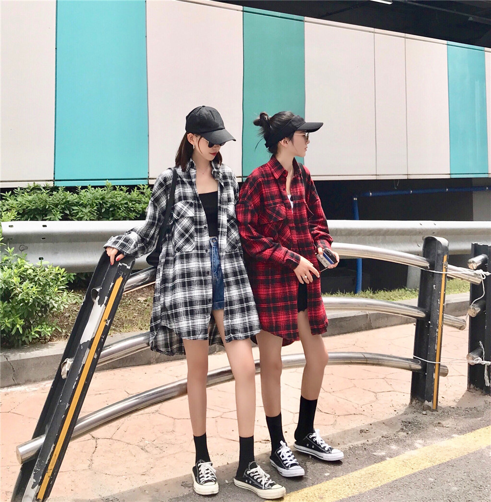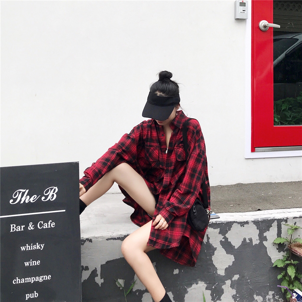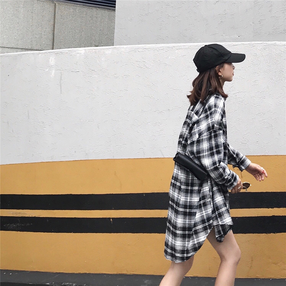 / 港味chic百搭寬松慵懶風秋季新款小清新外套復古中長款格子襯衫女