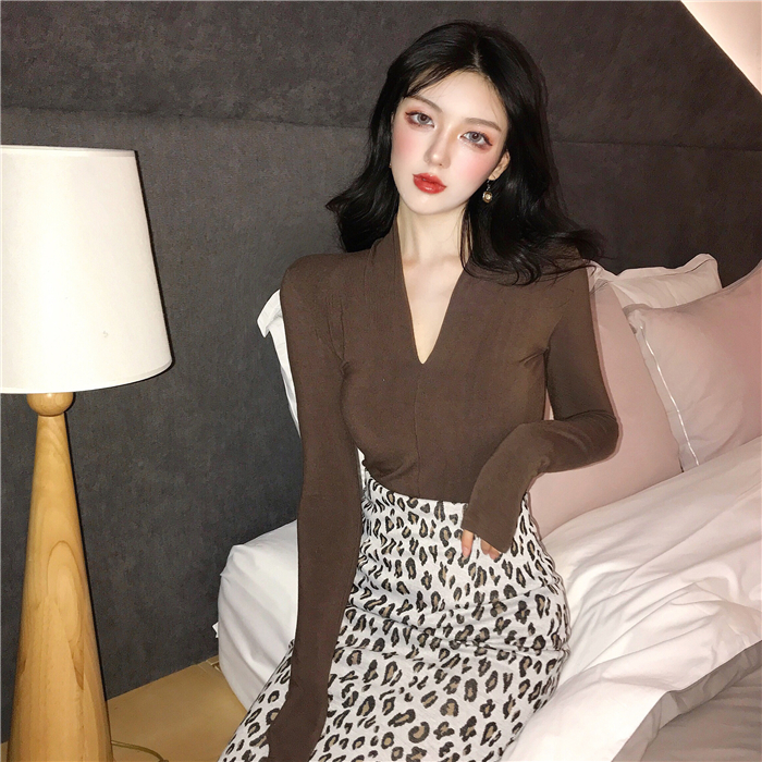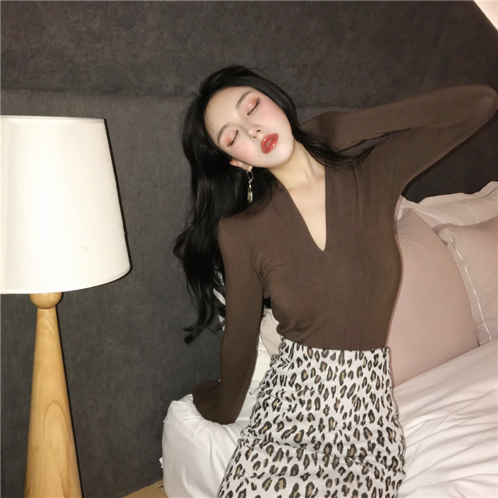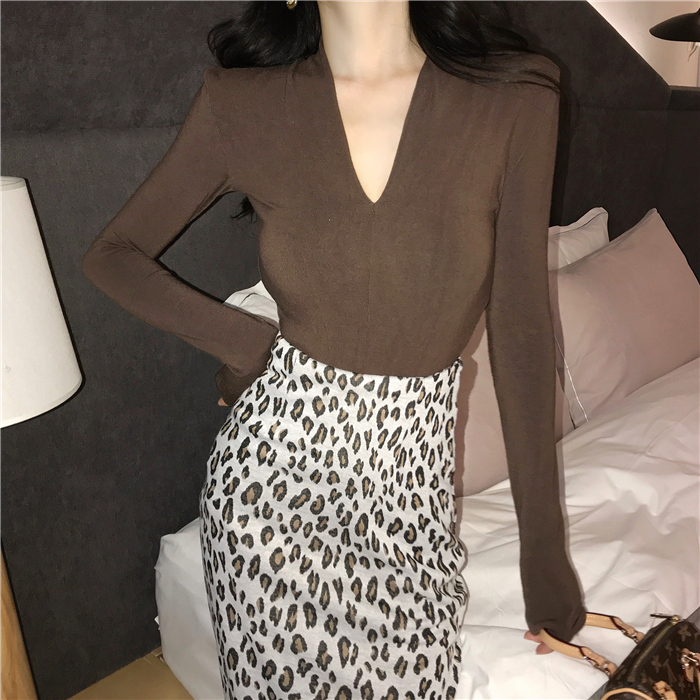 2018秋冬新款韓版時尚套裝v領長袖打底T恤包臀豹紋半身裙兩件套女