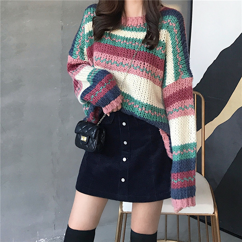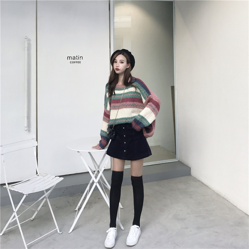 / 早秋復古拼色彩條懶惰風寬松毛衣+顯瘦高腰燈芯絨A字裙時尚兩件套