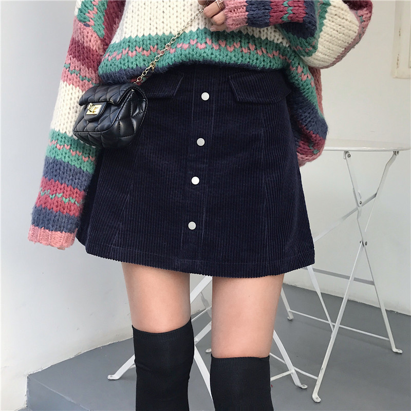 早秋復古拼色彩條懶惰風寬松毛衣+顯瘦高腰燈芯絨A字裙時尚兩件套