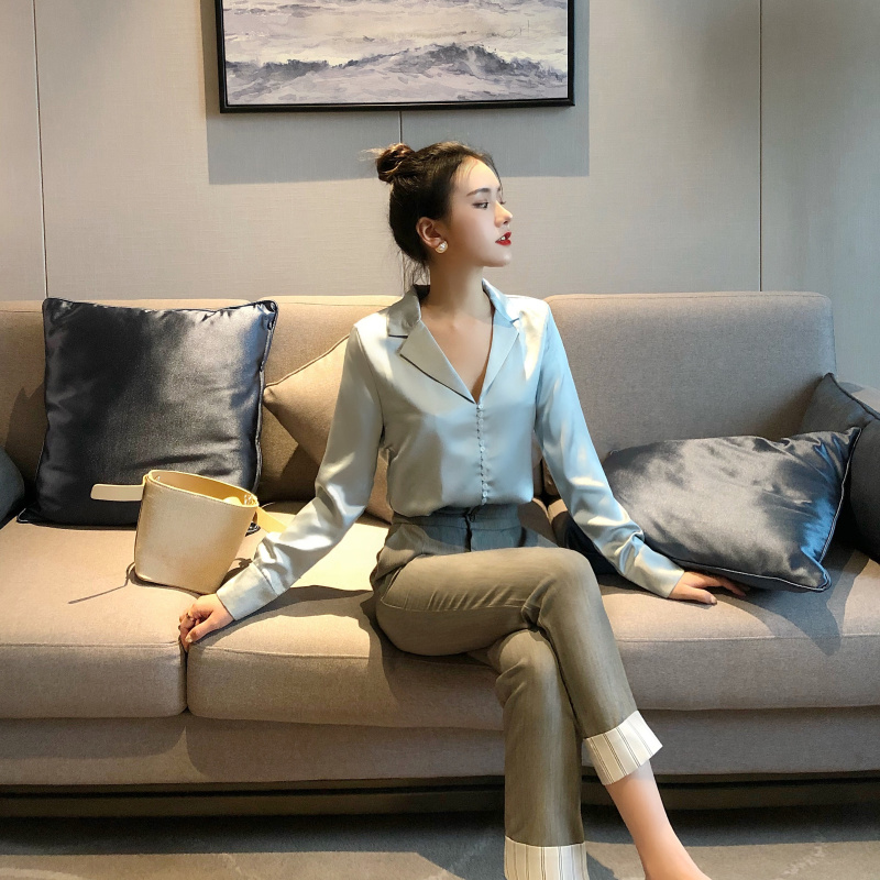 早秋緞面襯衫女秋裝上衣心機襯衣卷邊哈倫褲小腳休閑九分褲套裝潮